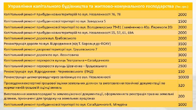 У пріоритеті залишаються роботи з благоустрою, ремонт доріг і прибудинкових територій, житлово-комунальне господарство, освіта, культура, охорона здоров’я, соціальний захист.