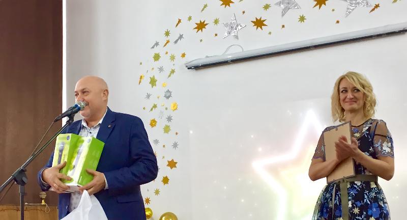 У подарунок до дня народження від Ковельської міської ради - інтерактивна дошка, аби в сучасній школі запроваджували новітні методи навчання, мікрофони - від управління культури, молоді та спорту. Його начальник Андрій Мигуля привітав присутніх ще піснею у своєму виконанні.