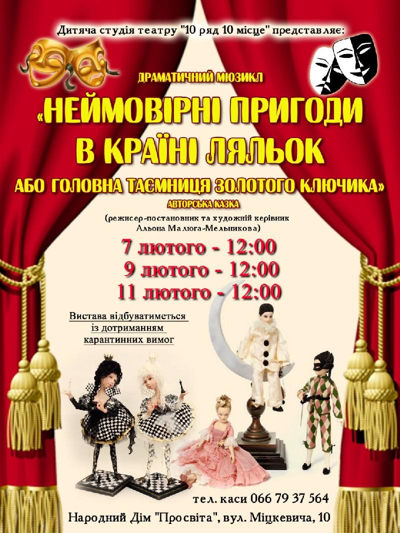 На численні прохання глядачів театр «10 ряд 10 місце» знову зіграє яскравий драматичний мюзикл "Неймовірні пригоди в Країні Ляльок або головна таємниця Золотого Ключика" - авторську казку за мотивами творів Карло Коллоді "Піноккіо" та Олексія Толстого "Золотий ключик або пригоди Буратіно".