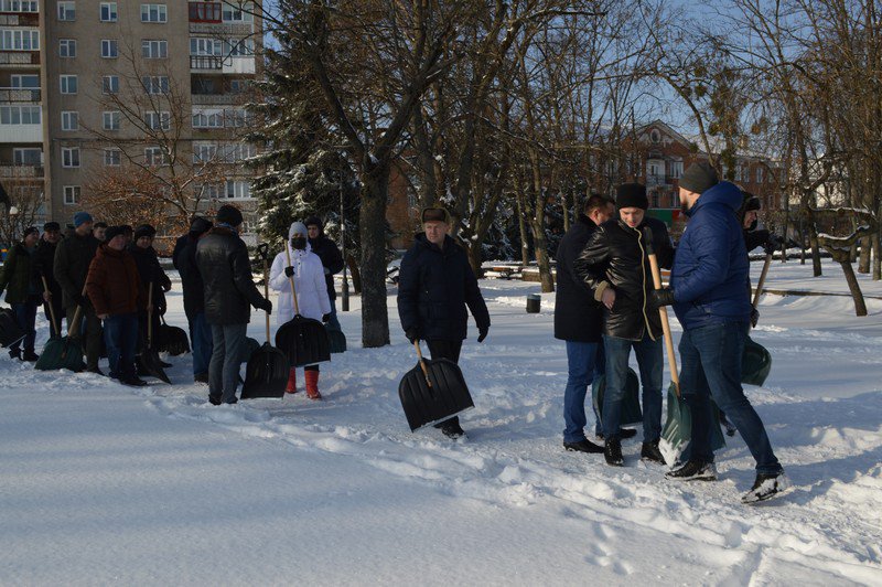 Представники міської влади, серед яких голова, його заступники, прибирали від снігу парк імені Лесі Українки.