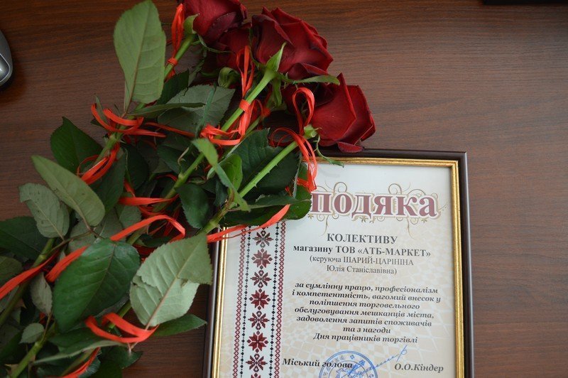 За сумлінну працю, компетентність і професіоналізм, вагомий внесок у розвиток торговельної мережі міста, задоволення запитів споживачів, активну громадську позицію та з нагоди Дня працівників торгівлі Подякою міського голови відзначено: підприємців Андрія Клівака та Наталію Михалевич, керуючу супермаркетом «АТБ-МАРКЕТ» Юлію Шарий-Царініну, керуючу супермаркетом «Салют» Ольгу Панасюк, директора кафе «Казка» Олену Олексюк.