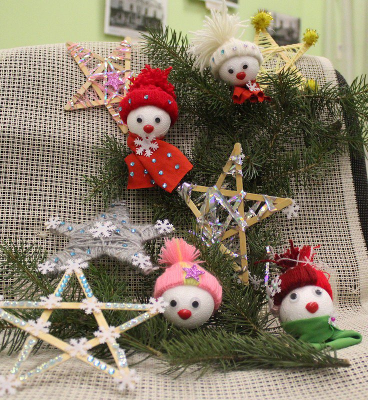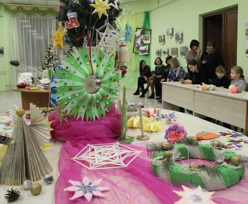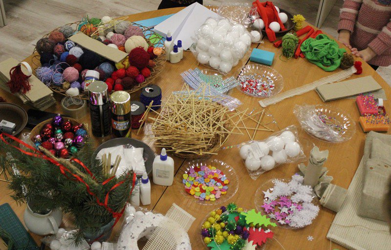 Безліч ялинкових прикрас, зроблених руками викладачів художньої школи, надихнули учасників зустрічі на творчість, сміливий прояв фантазії, і підказали, як можна із простих доступних речей підготувати вишуканий витвір прикладного мистецтва. В’язальні нитки, шпажки для шашлику, клаптики старого трикотажного одягу, сувора лляна бортівка, мереживо, товста канва, мішура, будівельний пінопласт, картон, клей, тасьма, шпагат, булавки, горіхи, сухоцвіти, ялинкові гілочки… Перелік нескінченний підручних матеріалів, з яких можна виготовити новорічні іграшки і сувеніри. А для святкового сяйва можна трішки додати аерозольного золота і срібла, стразів-«діамантів», червоних намистинок, сніжинок … всього, що підкаже уява.