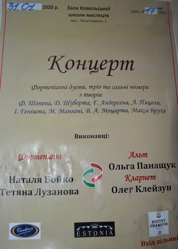 Завітавши на мистецький захід, ковельчани мають можливість насолодитися чудовою музикою у виконанні дуетів, тріо та солістів. Віртуози зіграють на фортепіано, кларнеті та альтові.