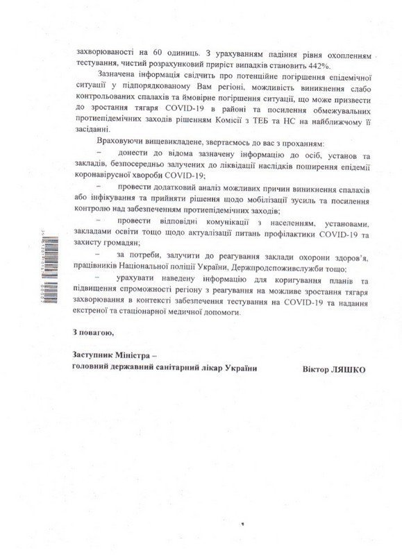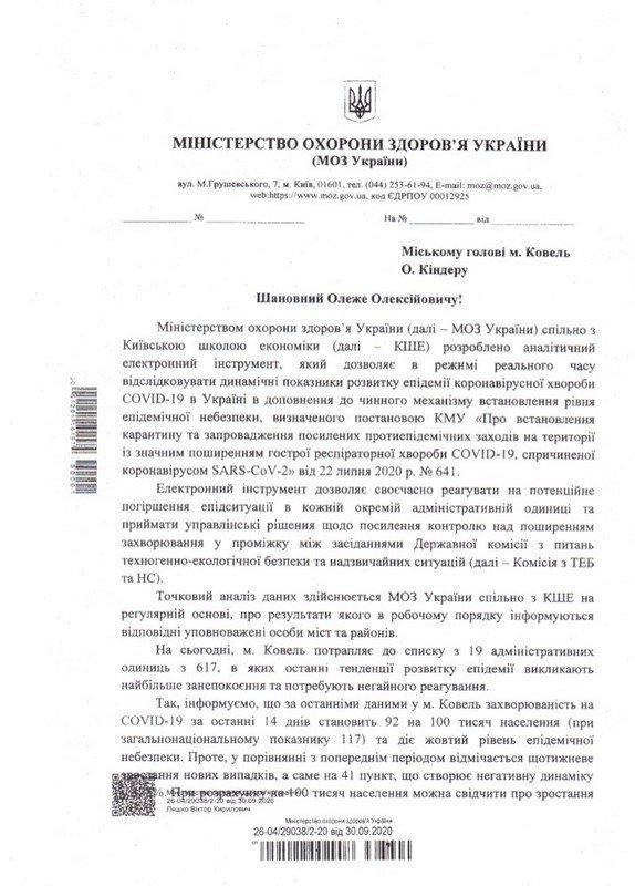 Також я отримав листа від головного державного санітарного лікаря України Віктора Ляшка, де зазначається, що Міністерством охорони здоровя спільно з Київською школою економіки розроблено аналітичний електронний інструмент, який дозволяє своєчасно реагувати на потенційне погіршення епідситуації в кожному населеному пункті.